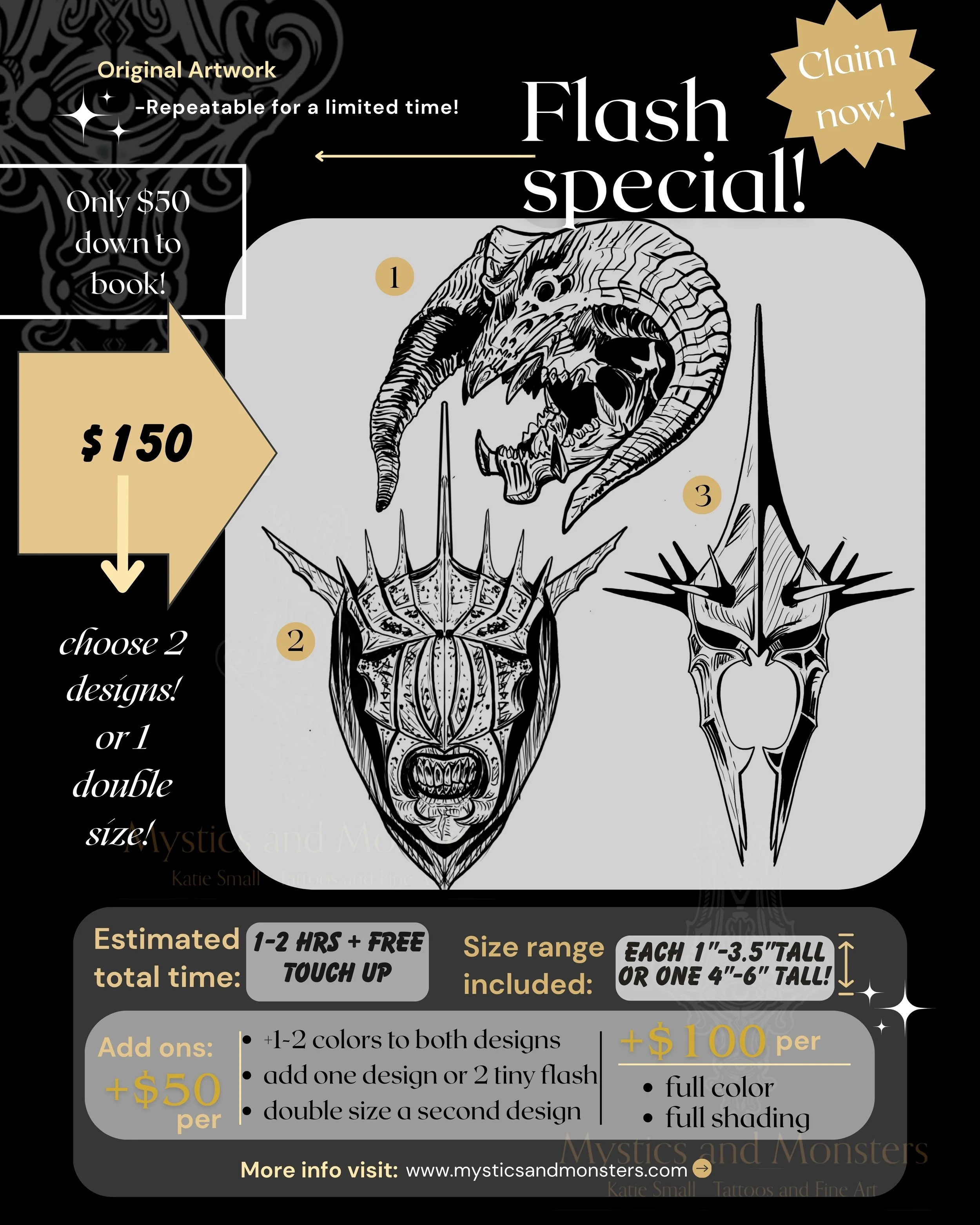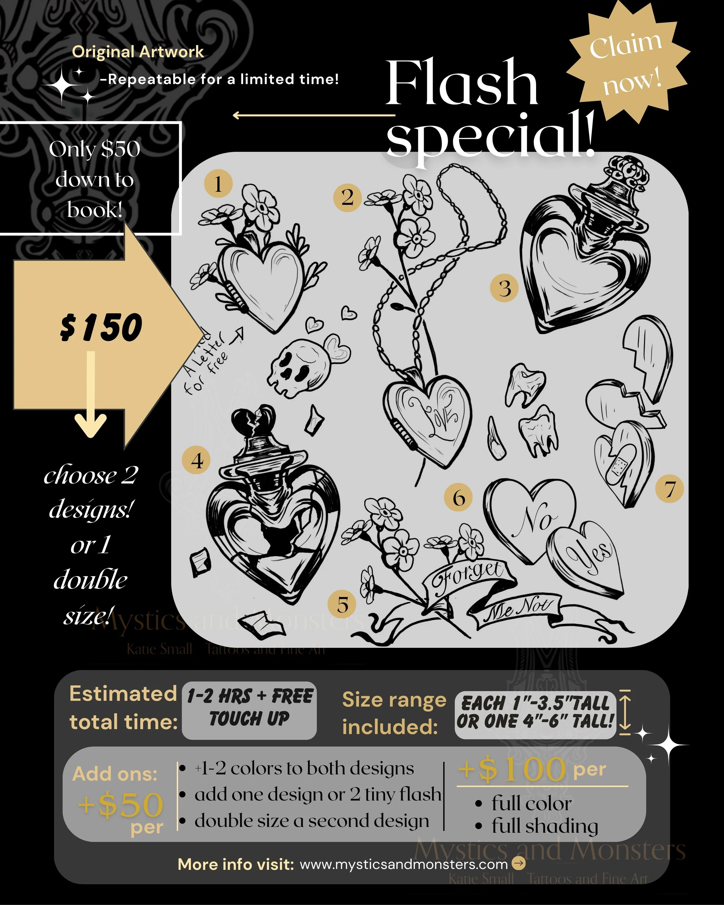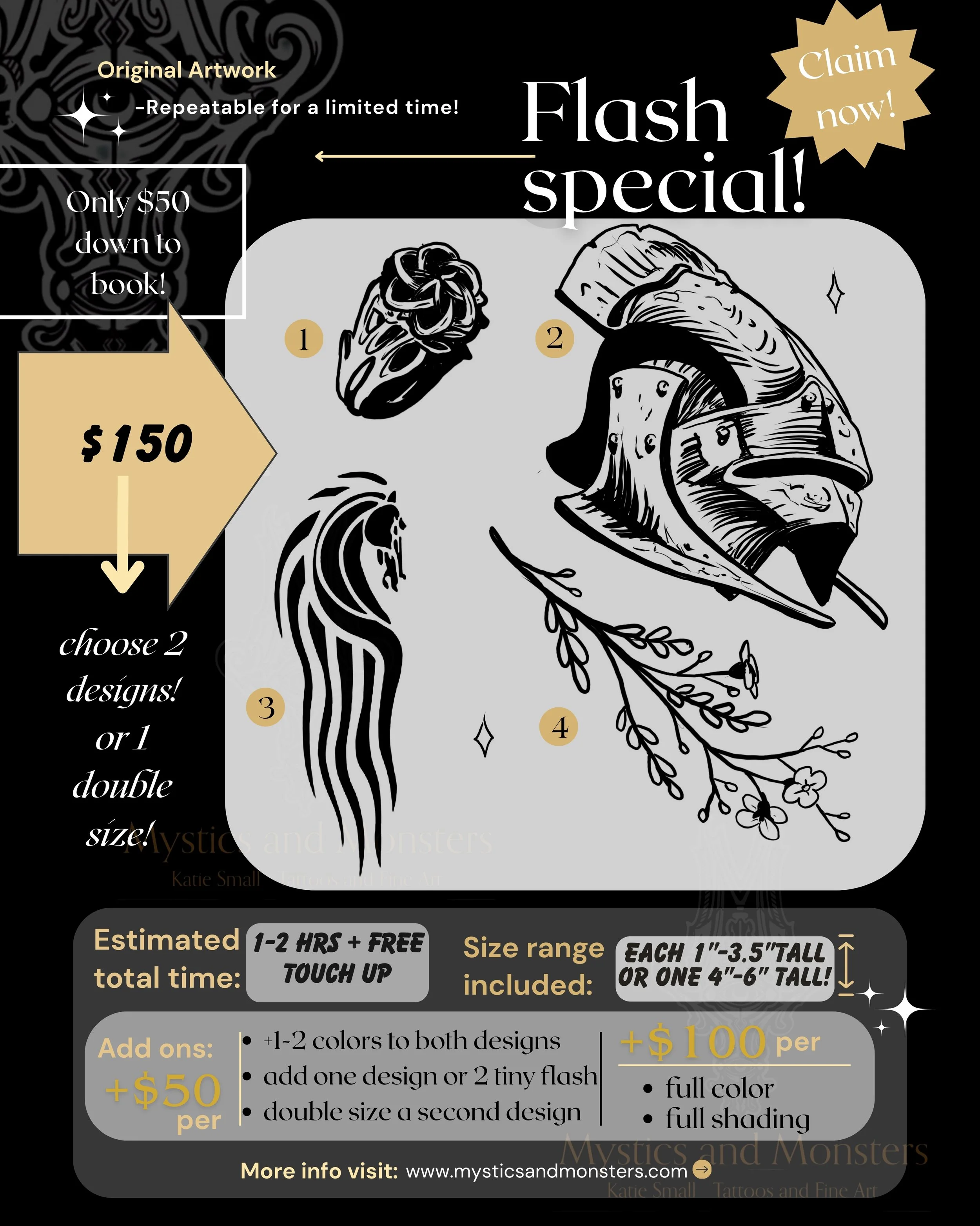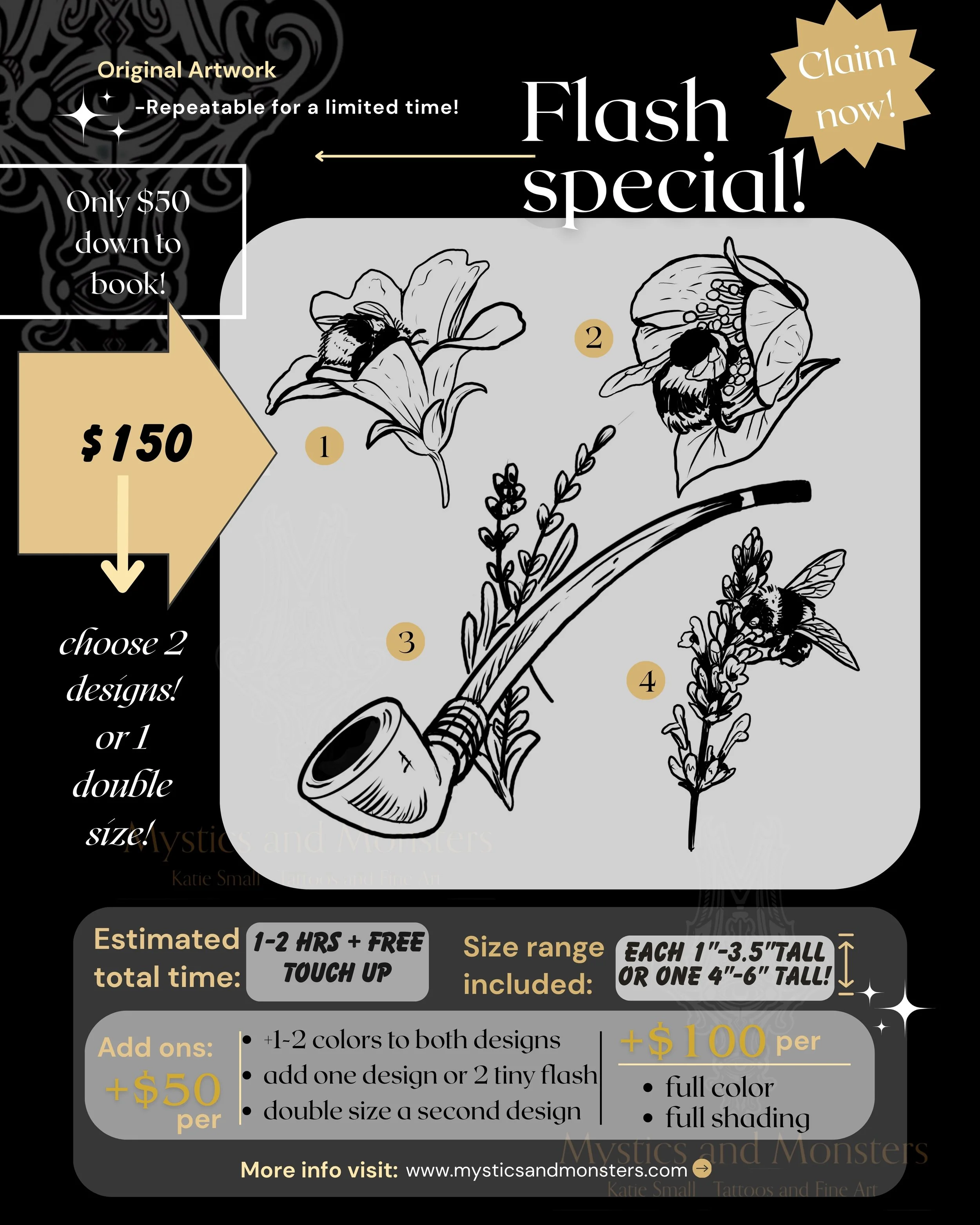 “I run these flash specials as a thank you to everyone who enjoys my art! I know life is expensive right now, and getting tattooed is a luxury! So this is my way of trying to make accessable deals while still making back the rising costs of all the overhead and supplies it takes to run a tattoo business! I’m excited to tattoo you soon, lets have fun! “ - Katie
