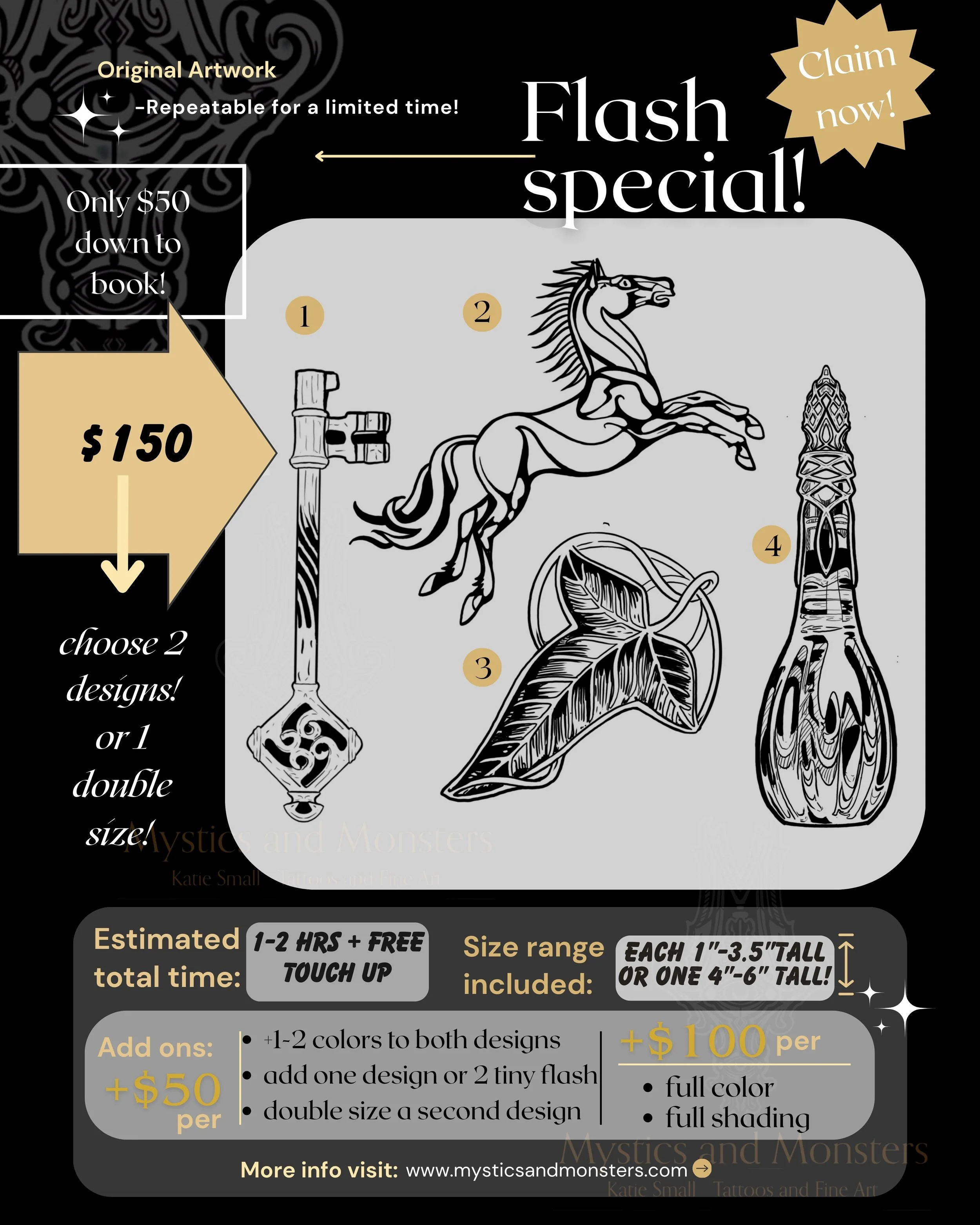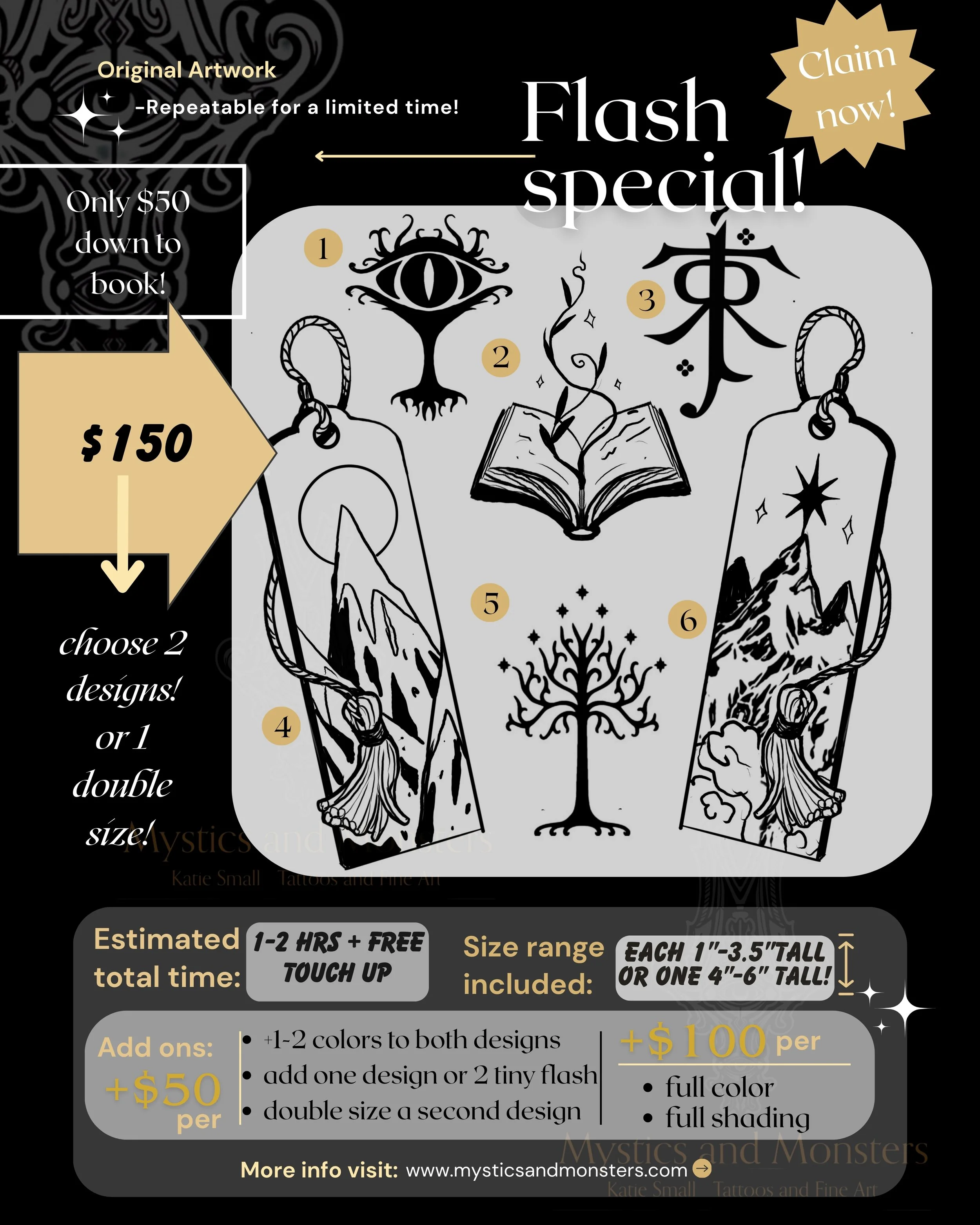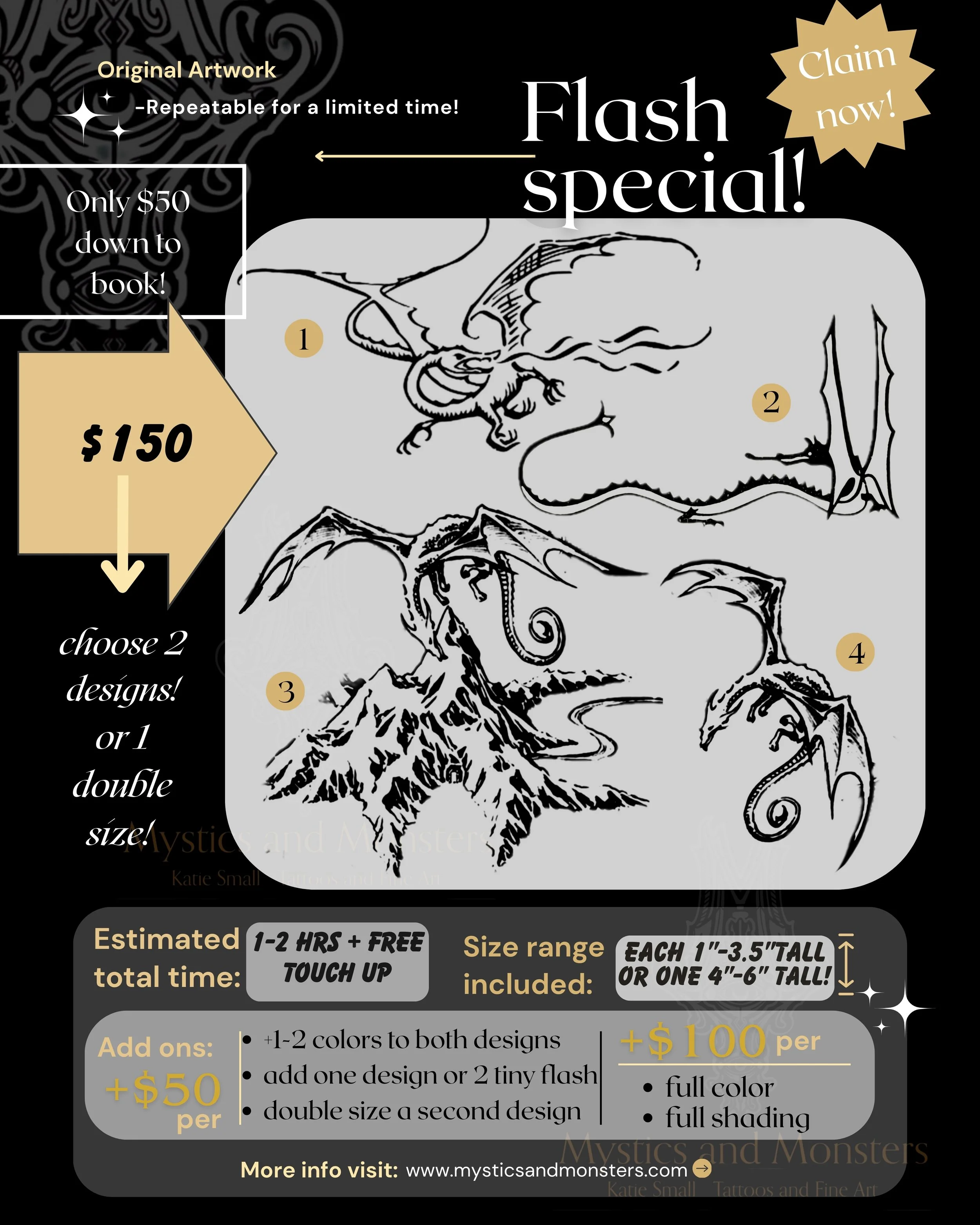 “I run these flash specials as a thank you to everyone who enjoys my art! I know life is expensive right now, and getting tattooed is a luxury! So this is my way of trying to make accessable deals while still making back the rising costs of all the overhead and supplies it takes to run a tattoo business! I’m excited to tattoo you soon, lets have fun! “ - Katie