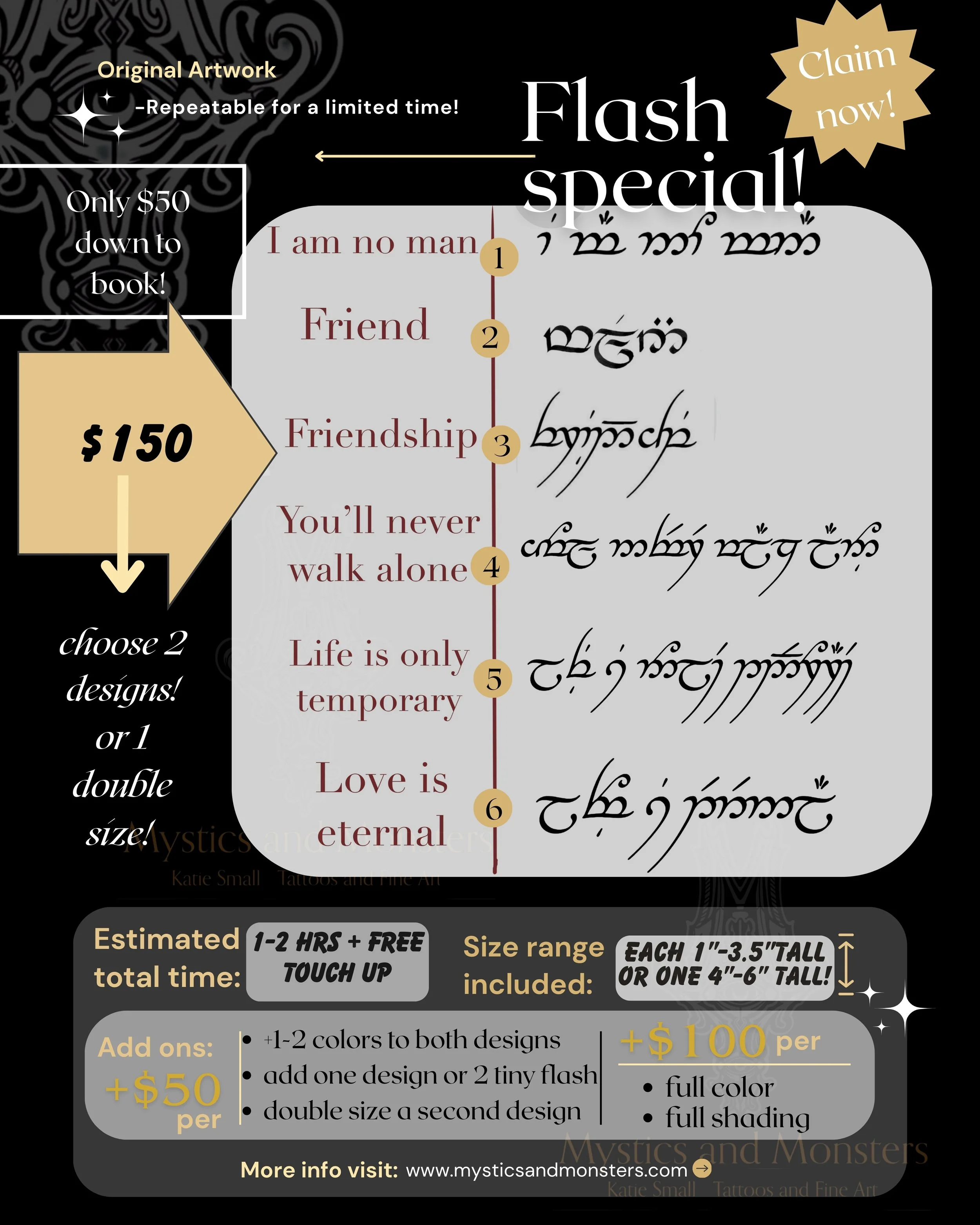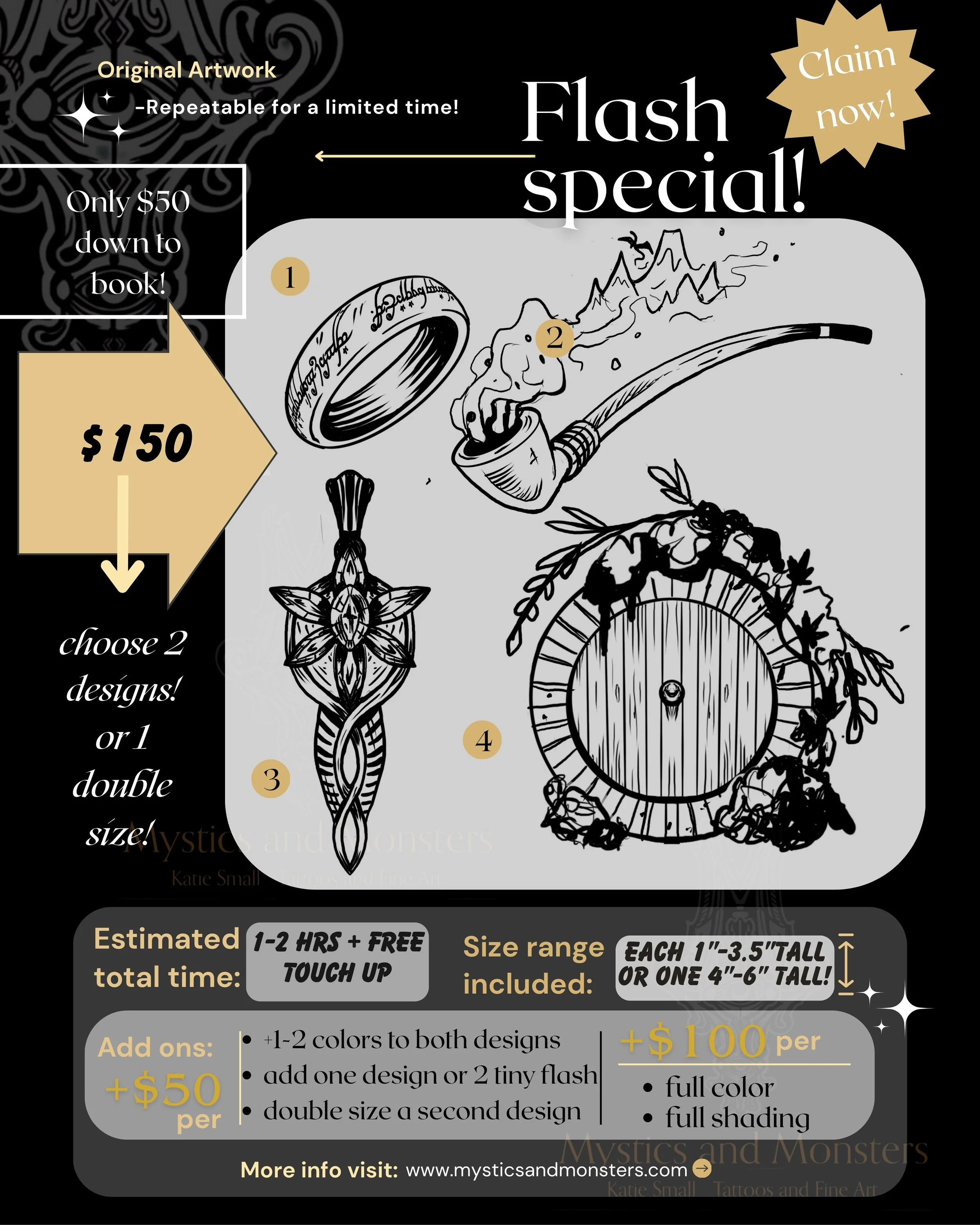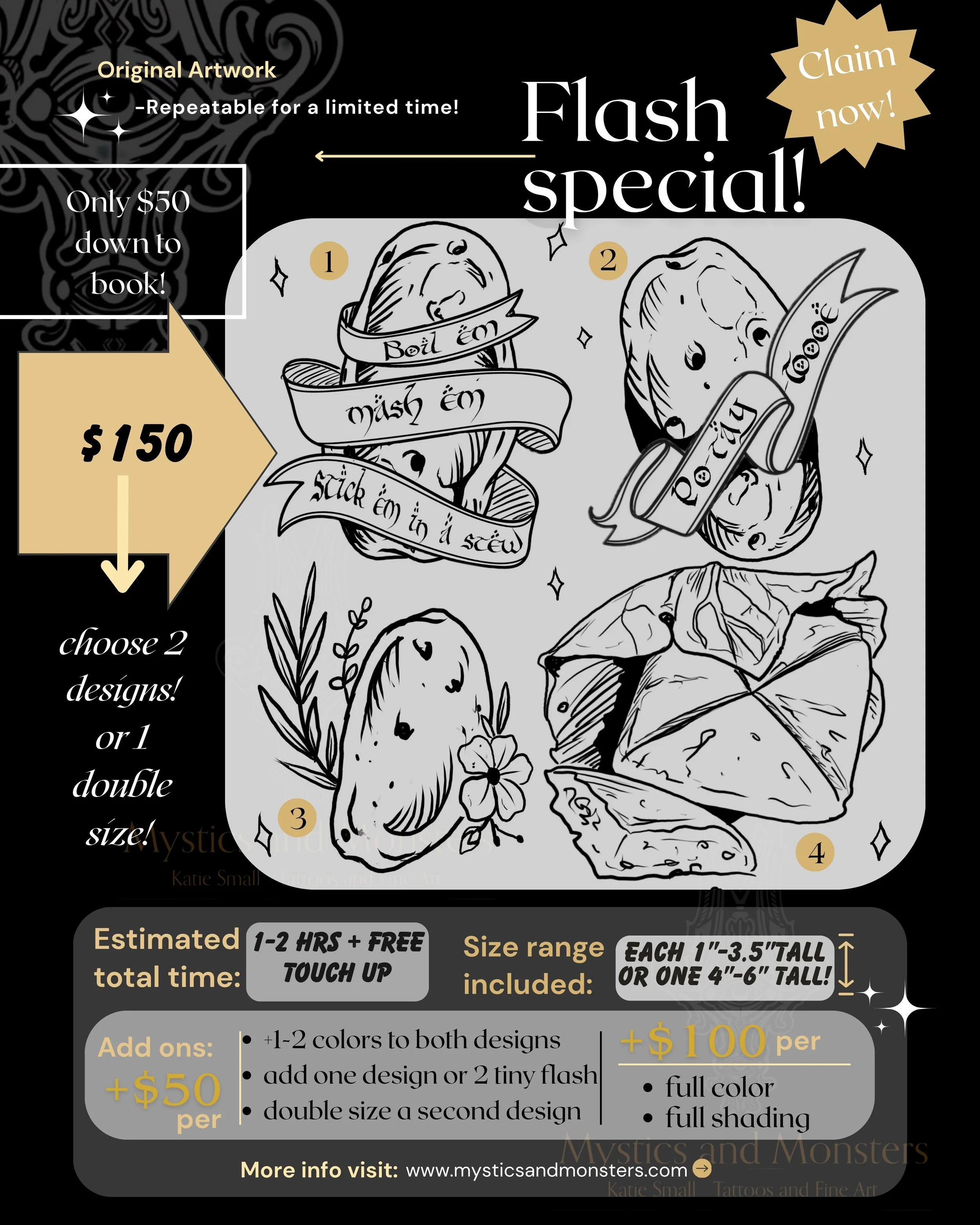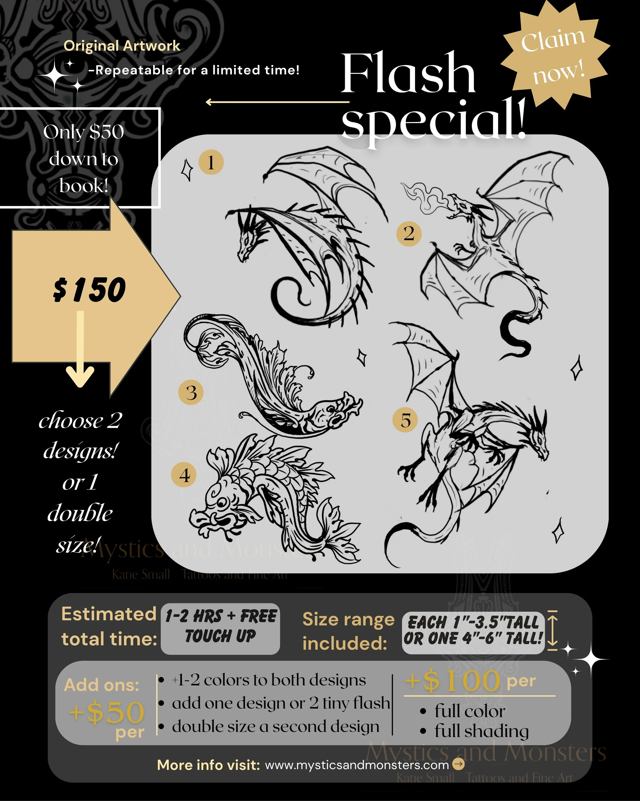 “I run these flash specials as a thank you to everyone who enjoys my art! I know life is expensive right now, and getting tattooed is a luxury! So this is my way of trying to make accessable deals while still making back the rising costs of all the overhead and supplies it takes to run a tattoo business! I’m excited to tattoo you soon, lets have fun! “ - Katie