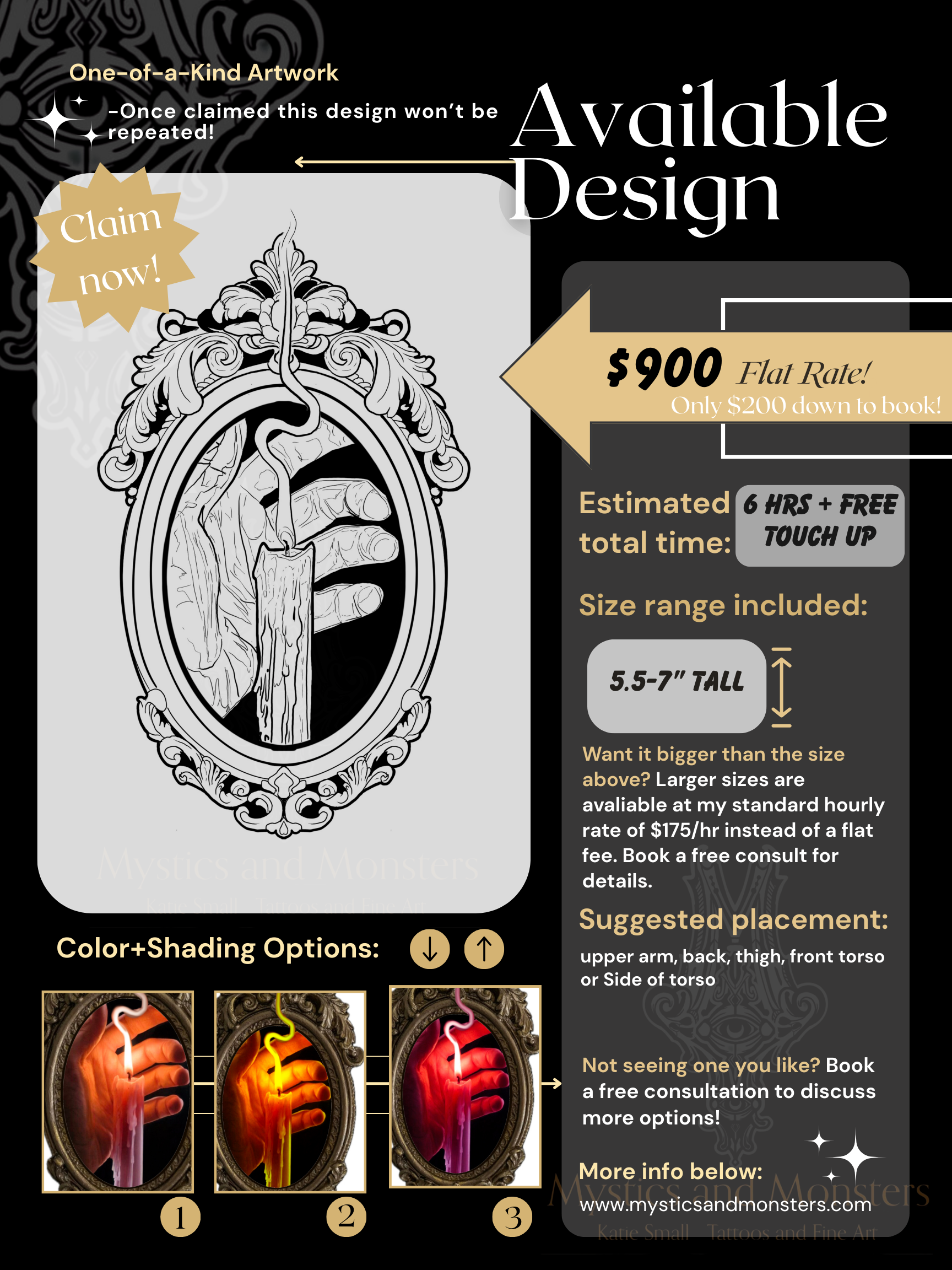 All of these pre-drawn designs are tattoos I would LOVE to tattoo on you and have lowered my usual rate in order to help people get the designs that bring us both joy!