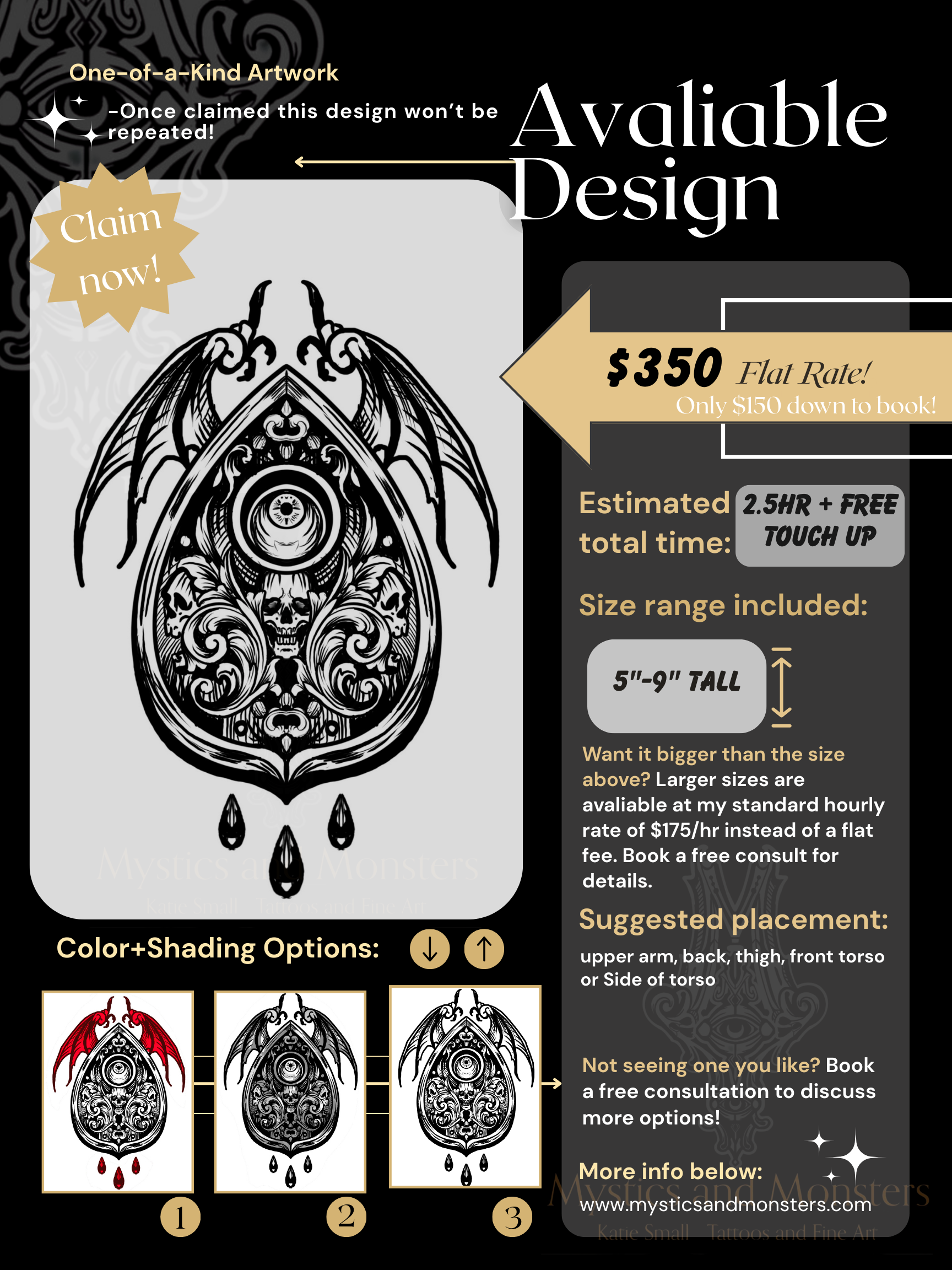 All of these pre-drawn designs are tattoos I would LOVE to tattoo on you and have lowered my usual rate in order to help people get the designs that bring us both joy!